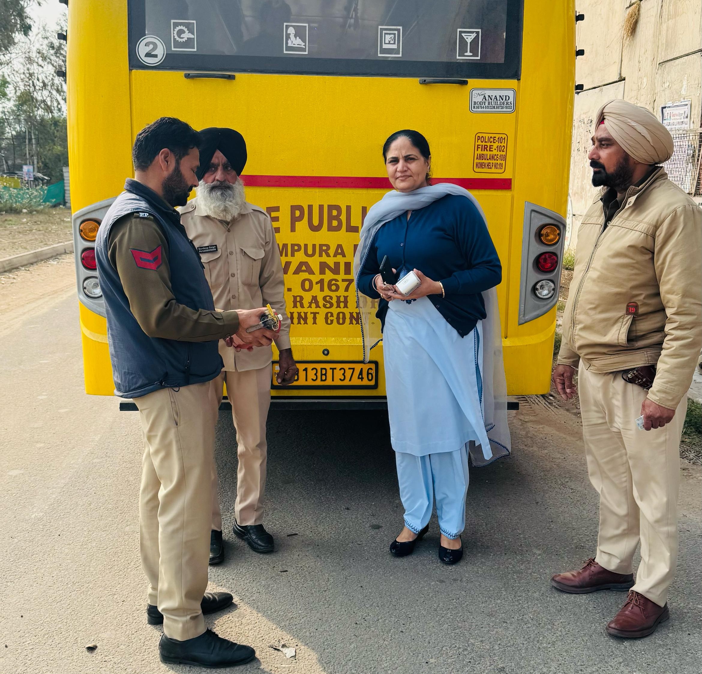 ਆਰ.ਟੀ.ਓ ਮਨਜੀਤ ਕੌਰ ਨੇ ਜਾਣਕਾਰੀ ਦਿੰਦਿਆਂ ਦੱਸਿਆ ਕਿ ਜਾਂਚ ਪੜਤਾਲ ਦੌਰਾਨ ਇੱਕ ਪ੍ਰਾਈਵੇਟ ਸਕੂਲ ਦੀ ਬੱਸ ਨੂੰ ਨਿਯਮਾਂ ਦੀ ਅਣਦੇਖੀ ਕਰਦਿਆਂ ਪਾਇਆ ਗਿਆ ਅਤੇ ਡਰਾਈਵਰ ਤੋਂ ਆਰ.ਸੀ ਅਤੇ ਲਾਈਸੈਂਸ ਨੂੰ ਰਿਟੇਨ ਕਰਦਿਆਂ ਹਦਾਇਤ ਕੀਤੀ ਗਈ ਕਿ ਸਕੂਲੀ ਵਿਦਿਆਰਥੀਆਂ ਨੂੰ ਘਰਾਂ ਵਿੱਚ ਛੱਡਣ ਉਪਰੰਤ ਸਕੂਲੀ ਬੱਸ ਨੂੰ ਵਾਪਸ ਲਿਆਂਦਾ ਜਾਵੇ ਤਾਂ ਕਿ ਇਮਪਾਊਂਡ ਕਰਨ ਦੀ ਕਾਰਵਾਈ ਕੀਤੀ ਜਾ ਸਕੇ।