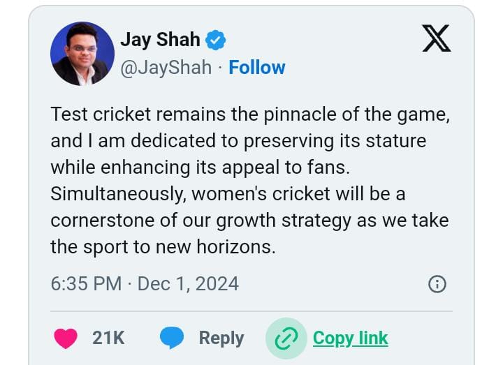 ਜੈ ਸ਼ਾਹ ਨੇ ਕਿਹਾ ਕਿ ‘ਟੈਸਟ ਕ੍ਰਿਕਟ ਖੇਡ ਦਾ ਸ਼ਿਖਰ ਬਣਿਆ ਹੋਇਆ ਹੈ ਅਤੇ ਮੈਂ ਪ੍ਰਸ਼ੰਸਕਾਂ ਲਈ ਇਸ ਦੇ ਆਕਰਸ਼ਣ ਨੂੰ ਵਧਾਉਂਦੇ ਹੋਏ ਕੱਦ ਨੂੰ ਬਣਾਈ ਰੱਖਣ ਲਈ ਸਮਰਪਿਤ ਹਾਂ। ਨਾਲ ਹੀ ਮਹਿਲਾ ਕ੍ਰਿਕਟ ਸਾਡੀ ਵਿਕਾਸ ਰਣਨੀਤੀ ਦਾ ਆਧਾਰ ਹੋਵੇਗਾ ਕਿਉਂਕਿ ਅਸੀਂ ਇਸ ਖੇਡ ਨੂੰ ਨਵੀਆਂ ਉਚਾਈਆਂ ‘ਤੇ ਲੈ ਕੇ ਜਾਵਾਂਗੇ।