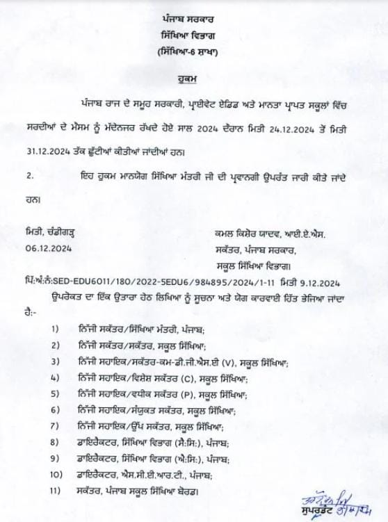 ਇਸ ਸਬੰਧੀ ਸਿੱਖਿਆ ਵਿਭਾਗ ਦੇ ਸਕੱਤਰ ਕਮਲ ਕਿਸ਼ੋਰ ਯਾਦਵ ਵੱਲੋਂ ਜਾਰੀ ਪੱਤਰ ਵਿਚ ਕਿਹਾ ਗਿਆ ਹੈ ਕਿ ਸੂਬੇ ਦੇ ਸਮੂਹ ਸਰਕਾਰੀ, ਪ੍ਰਾਈਵੇਟ ਏਡਿਡ ਅਤੇ ਮਾਨਤਾ ਪ੍ਰਾਪਤ ਸਕੂਲਾਂ ਵਿਚ ਸਰਦੀਆਂ ਦੇ ਮੌਸਮ ਨੂੰ ਮੱਦੇਨਜ਼ਰ ਰੱਖਦੇ ਹੋਏ ਸਾਲ 2024 ਦੌਰਾਨ ਮਿਤੀ 24.12.2024 ਤੋਂ ਮਿਤੀ 31.12. 2024 ਤੱਕ ਛੁੱਟੀਆਂ ਕੀਤੀਆਂ ਜਾਂਦੀਆਂ ਹਨ।