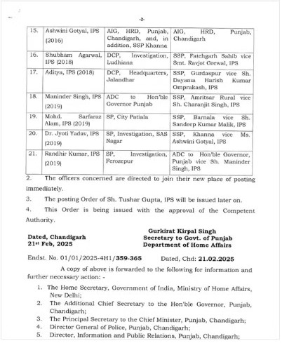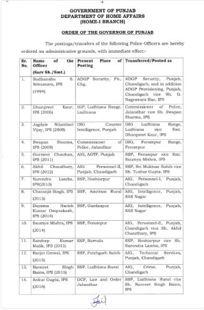 ਹੁਣ ਗੁਰਮੀਤ ਸਿੰਘ ਚੌਹਾਨ ਨੂੰ ਐਸ. ਐਸ. ਪੀ. ਫਿਰੋਜ਼ਪੁਰ, ਅਖਿਲ ਚੌਧਰੀ ਨੂੰ ਐਸ. ਐਸ. ਪੀ. ਮੁਕਤਸਰ ਸਾਹਿਬ, ਸੰਦੀਪ ਕੁਮਾਰ ਮਲਿਕ ਨੂੰ ਐਸ. ਐਸ. ਪੀ. ਹੁਸ਼ਿਆਰਪੁਰ, ਅੰਕੁਰ ਗੁਪਤਾ ਨੂੰ ਐਸ. ਐਸ. ਪੀ. ਲੁਧਿਆਣਾ, ਸ਼ੁਭਮ ਅਗਰਵਾਲ ਨੂੰ ਐਸ. ਐਸ. ਪੀ. ਫਤਿਹਗੜ੍ਹ ਸਾਹਿਬ, ਮਨਿੰਦਰ ਸਿੰਘ ਨੂੰ ਐਸ. ਐਸ. ਪੀ. ਦਿਹਾਤੀ ਅੰਮ੍ਰਿਤਸਰ, ਮੁਹੰਮਦ ਸਰਫਾਜ਼ ਨੂੰ ਐਸ. ਐਸ. ਪੀ. ਬਰਨਾਲਾ, ਜੋਤੀ ਯਾਦਵ ਨੂੰ ਐਸ. ਐਸ. ਪੀ. ਖੰਨਾ ਨਿਯੁਕਤ ਕੀਤਾ ਗਿਆ ਹੈ।