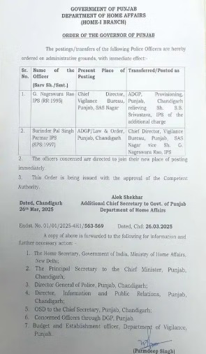 ਇਸ ਦੇ ਨਾਲ ਹੀ, ਆਈਪੀਐਸ ਜੀ ਨਾਗੇਸ਼ਵਰ ਰਾਓ, ਜੋ ਪਹਿਲਾਂ ਮੁੱਖ ਨਿਰਦੇਸ਼ਕ ਵਿਜੀਲੈਂਸ ਬਿਊਰੋ ਪੰਜਾਬ ਵਜੋਂ ਤਾਇਨਾਤ ਸਨ, ਦਾ ਤਬਾਦਲਾ ਕਰ ਦਿੱਤਾ ਗਿਆ ਹੈ ਅਤੇ ਹੁਣ ਉਨ੍ਹਾਂ ਨੂੰ ਸੁਰਿੰਦਰ ਕੁਮਾਰ ਸ਼੍ਰੀਵਾਸਤਵ ਦੇ ਅਹੁਦੇ ਦਾ ਵਾਧੂ ਚਾਰਜ ਦਿੱਤਾ ਗਿਆ ਹੈ।