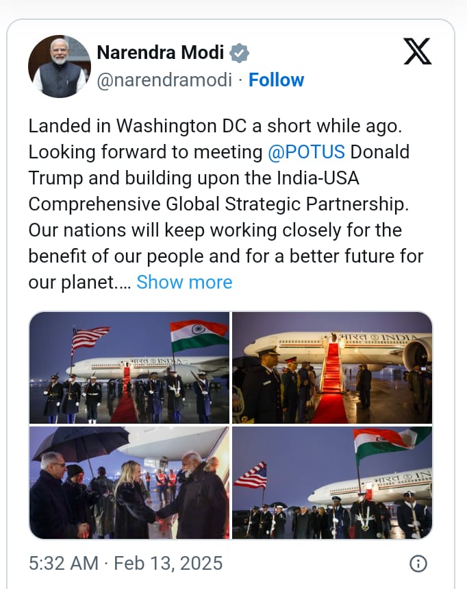 ਵਾਸ਼ਿੰਗਟਨ ਪਹੁੰਚਣ ਤੋਂ ਬਾਅਦ ਪੀ. ਐੱਮ. ਮੋਦੀ ਨੇ ਇੰਸਟਾਗ੍ਰਾਮ ‘ਤੇ ਟਵੀਟ ਕੀਤਾ ਅਤੇ ਲਿਖਿਆ ਕਿ ਉਹ ਕੁਝ ਸਮਾਂ ਪਹਿਲਾਂ ਹੀ ਵਾਸ਼ਿੰਗਟਨ ਡੀਸੀ ਪਹੁੰਚੇ ਹਨ। ਇਸ ਦੌਰਾਨ ਮੈਂ ਅਮਰੀਕੀ ਰਾਸ਼ਟਰਪਤੀ ਡੋਨਾਲਡ ਟਰੰਪ ਨੂੰ ਮਿਲਾਂਗਾ। ਮੈਂ ਭਾਰਤ-ਅਮਰੀਕਾ ਵਿਆਪਕ ਗਲੋਬਲ ਰਣਨੀਤਕ ਭਾਈਵਾਲੀ ਨੂੰ ਅੱਗੇ ਵਧਾਉਣ ਲਈ ਕੰਮ ਕਰਾਂਗਾ। ਮੈਂ ਇਸ ਲਈ ਕਾਫ਼ੀ ਉਤਸ਼ਾਹਿਤ ਹਾਂ।