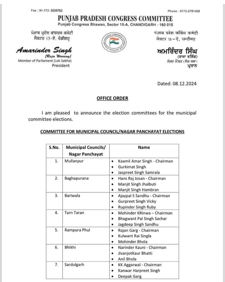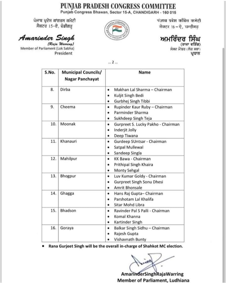 ਪੰਜਾਬ ਪ੍ਰਦੇਸ਼ ਕਾਂਗਰਸ ਕਮੇਟੀ ਦੇ ਪ੍ਰਧਾਨ ਤੇ ਲੁਧਿਆਣਾ ਤੋਂ ਸੰਸਦ ਮੈਂਬਰ ਅਮਰਿੰਦਰ ਸਿੰਘ ਰਾਜਾ ਵੜਿੰਗ ਵੱਲੋਂ ਇਨ੍ਹਾਂ ਕਮੇਟੀਆਂ ਦੀ ਸੂਚੀ ਜਾਰੀ ਕੀਤੀ ਗਈ ਹੈ। ਉਨ੍ਹਾਂ ਵੱਲੋਂ 16 ਨਗਰ ਕੌਂਸਲਾਂ ਤੇ ਨਗਰ ਪੰਚਾਇਤਾਂ ਲਈ ਅਹੁਦੇਦਾਰਾਂ ਤੇ ਮੈਂਬਰਾਂ ਦਾ ਐਲਾਨ ਕੀਤਾ ਗਿਆ ਹੈ। ਇਸ ਤੋਂ ਇਲਾਵਾ ਸ਼ਾਹਕੋਟ ਦੀਆਂ ਮਿਊਂਸੀਪਲ ਚੋਣਾਂ ਲਈ ਰਾਣਾ ਗੁਰਜੀਤ ਸਿੰਘ ਨੂੰ ਇੰਚਾਰਜ ਥਾਪਿਆ ਗਿਆ ਹੈ।