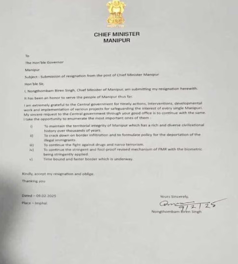 ਇੰਫਾਲ : ਮਨੀਪੁਰ ਦੇ ਮੁੱਖ ਮੰਤਰੀ ਐਨ. ਬੀਰੇਨ ਸਿੰਘ ਨੇ ਐਤਵਾਰ ਨੂੰ ਅਸਤੀਫਾ ਦੇ ਦਿੱਤਾ। ਉਨ੍ਹਾਂ ਆਪਣਾ ਅਸਤੀਫਾ ਰਾਜਪਾਲ ਅਜੈ ਕੁਮਾਰ ਭੱਲਾ ਨੂੰ ਸੌਂਪ ਦਿੱਤਾ ਹੈ। ਉਨ੍ਹਾਂ ਨੇ ਆਪਣੀ ਚਿੱਠੀ ‘ਚ ਲਿਖਿਆ, ‘‘ਹੁਣ ਤੱਕ ਮਨੀਪੁਰ ਦੇ ਲੋਕਾਂ ਦੀ ਸੇਵਾ ਕਰਨਾ ਮੇਰੇ ਲਈ ਸਨਮਾਨ ਦੀ ਗੱਲ ਰਹੀ ਹੈ। ਮੈਂ ਮਨੀਪੁਰ ਦੇ ਹਰ ਨਾਗਰਿਕ ਦੇ ਹਿੱਤਾਂ ਦੀ ਰੱਖਿਆ ਲਈ ਕੇਂਦਰ ਸਰਕਾਰ ਦੀ ਸਮੇਂ ਸਿਰ ਕਾਰਵਾਈ, ਦਖਲਅੰਦਾਜ਼ੀ, ਵਿਕਾਸ ਕਾਰਜਾਂ ਅਤੇ ਵੱਖ-ਵੱਖ ਪ੍ਰੋਜੈਕਟਾਂ ਨੂੰ ਲਾਗੂ ਕਰਨ ਲਈ ਬਹੁਤ ਧੰਨਵਾਦੀ ਹਾਂ।