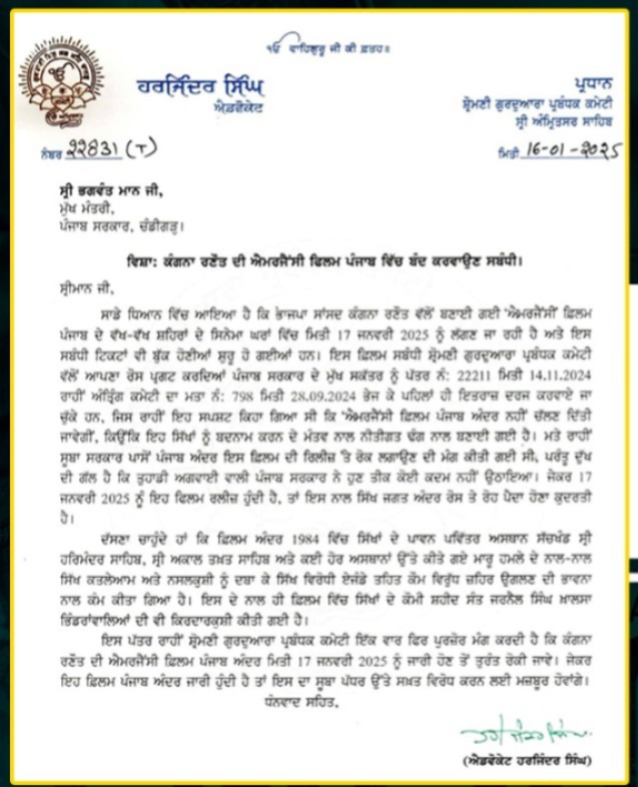 ਅੰਮ੍ਰਿਤਸਰ – ਸ਼੍ਰੋਮਣੀ ਗੁਰਦੁਆਰਾ ਪ੍ਰਬੰਧਕ ਕਮੇਟੀ ਨੇ ਸਿੱਖਾਂ ਦਾ ਅਕਸ ਖ਼ਰਾਬ ਕਰਨ ਵਾਲੀ ਅਤੇ ਇਤਿਹਾਸ ਨੂੰ ਗਲਤ ਪੇਸ਼ ਕਰਦੀ ਅਦਾਕਾਰਾ ਕੰਗਨਾ ਰਣੌਤ ਦੀ ਫ਼ਿਲਮ ਐਮਰਜੈਂਸੀ ’ਤੇ ਸਖ਼ਤ ਇਤਰਾਜ਼ ਪ੍ਰਗਟ ਕਰਦਿਆਂ ਇਸ ਦੇ 17 ਜਨਵਰੀ 2025 ਨੂੰ ਰਿਲੀਜ਼ ਹੋਣ ਉੱਤੇ ਪੰਜਾਬ ਅੰਦਰ ਰੋਕ ਲਗਾਉਣ ਦੀ ਮੰਗ ਕੀਤੀ ਹੈ।