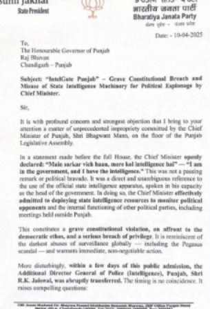 ਜਾਖੜ ਨੇ ਕਿਹਾ ਕਿ ਮੁੱਖ ਮੰਤਰੀ ਭਗਵੰਤ ਮਾਨ ਦਾਅਵਾ ਕਰਦੇ ਹਨ ਕਿ ਉਹ ਬੜੇ ਬੁੱਧੀਮਾਨ ਹਨ ਤੇ ਉਨ੍ਹਾਂ ਕੋਲ ਹੀ ਗ੍ਰਹਿ ਮੰਤਰੀ ਹੋਣ ਦੇ ਨਾਤੇ ਇੰਟਲੀਜੈਂਸ ਵਿਭਾਗ ਦੀ ਜ਼ਿੰਮੇਵਾਰੀ ਹੈ। ਇਸ ਲਈ ਮੁੱਖ ਮੰਤਰੀ ਬਤੌਰ ਸੂਬੇ ਦੇ ਮੁਖੀ ਅਤੇ ਇੰਟਲੀਜੈਂਸ ਦੇ ਮੁਖੀ ਹੋਣ ਦੇ ਨਾਤੇ ਇਸ ਦੀ ਜ਼ਿੰਮੇਵਾਰੀ ਖ਼ੁਦ ਲੈਣ।