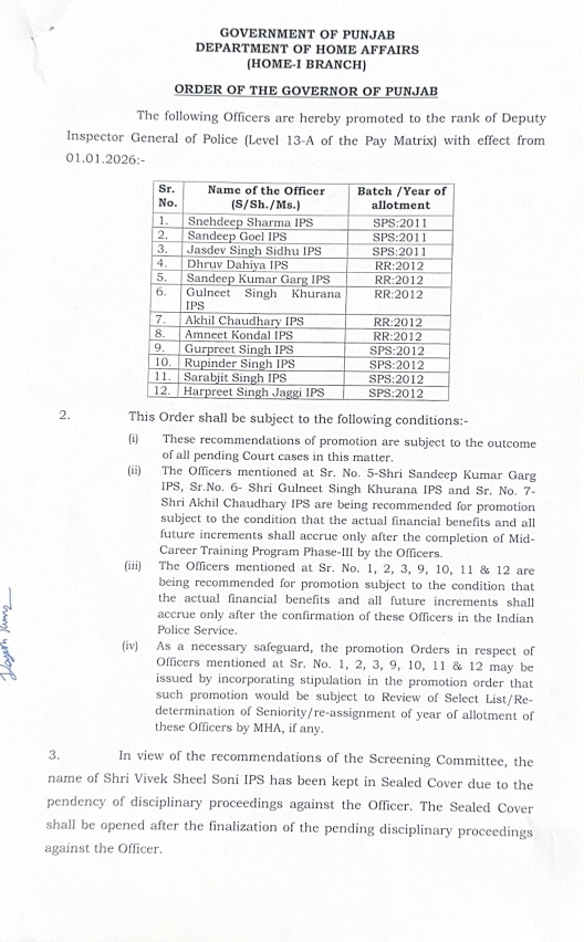 ਚੰਡੀਗੜ੍ਹ, 2 ਜਨਵਰੀ : ਪੰਜਾਬ ਸਰਕਾਰ ਦੇ ਗ੍ਰਹਿ ਵਿਭਾਗ ਵੱਲੋਂ ਵੱਡਾ ਪ੍ਰਸ਼ਾਸਕੀ ਫ਼ੈਸਲਾ ਲੈਂਦੇ ਹੋਏ 12 ਆਈ. ਪੀ. ਐੱਸ. ਅਧਿਕਾਰੀਆਂ ਨੂੰ ਡਿਪਟੀ ਇੰਸਪੈਕਟਰ ਜਨਰਲ ਆਫ਼ ਪੁਲਸ (ਡੀ. ਆਈ. ਜੀ) ਦੇ ਅਹੁਦੇ ਵਜੋਂ ਤਰੱਕੀ ਦਿੱਤੀ ਗਈ ਹੈ। ਇਹ ਤਰੱਕੀਆਂ 1 ਜਨਵਰੀ 2026 ਤੋਂ ਲਾਗੂ ਮੰਨੀਆਂ ਜਾਣਗੀਆਂ।