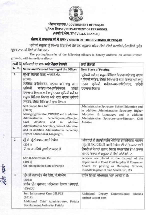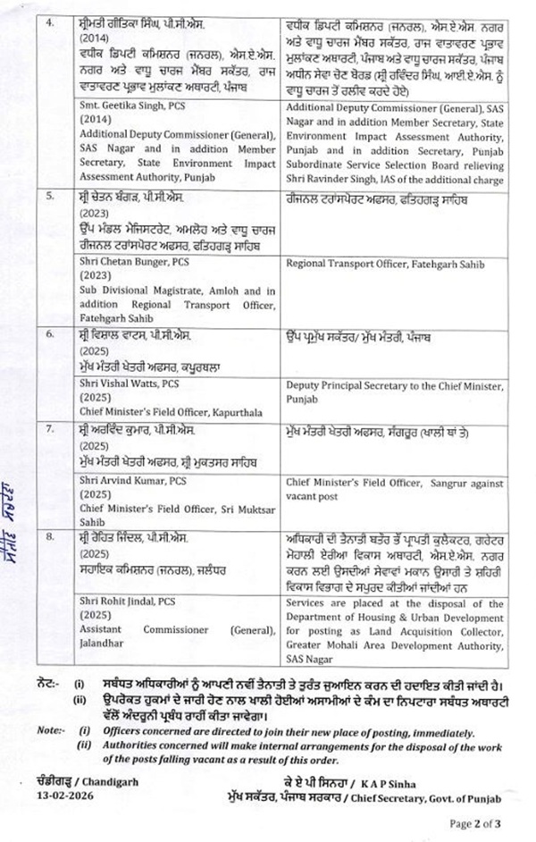 ਸਰਕਾਰੀ ਬੁਲਾਰੇ ਅਨੁਸਾਰ, ਇਹ ਤਬਾਦਲੇ ਪ੍ਰਸ਼ਾਸਕੀ ਕੰਮਕਾਜ ਨੂੰ ਵਧੇਰੇ ਸੁਚਾਰੂ ਅਤੇ ਪ੍ਰਭਾਵਸ਼ਾਲੀ ਬਣਾਉਣ ਦੇ ਉਦੇਸ਼ ਨਾਲ ਕੀਤੇ ਗਏ ਹਨ। ਨਵੀਂ ਸੂਚੀ ਮੁਤਾਬਕ ਵੱਖ-ਵੱਖ ਜ਼ਿਲ੍ਹਿਆਂ ਅਤੇ ਵਿਭਾਗਾਂ ’ਚ ਤਾਇਨਾਤ ਇਨ੍ਹਾਂ ਅਧਿਕਾਰੀਆਂ ਨੂੰ ਤੁਰੰਤ ਪ੍ਰਭਾਵ ਨਾਲ ਆਪਣਾ ਨਵਾਂ ਕਾਰਜਭਾਰ ਸੰਭਾਲਣ ਦੇ ਨਿਰਦੇਸ਼ ਦਿੱਤੇ ਗਏ ਹਨ।