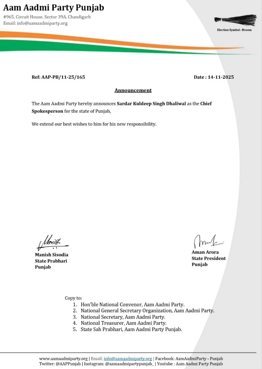 ਆਮ ਆਦਮੀ ਪਾਰਟੀ ਪੰਜਾਬ ਦਾ ਮੁੱਖ ਬੁਲਾਰਾ ਨਿਯੁਕਤ