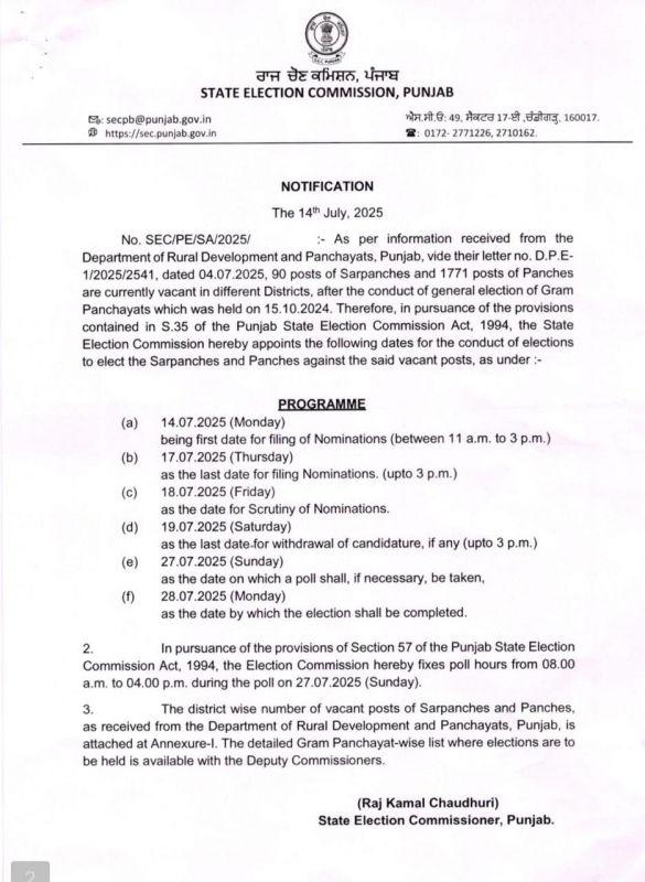 90 ਸਰਪੰਚ ਅਤੇ 1771 ਪੰਚਾਂ ਦੀ 27 ਜੁਲਾਈ ਨੂੰ ਹੋਵੇਗੀ ਚੋਣ
