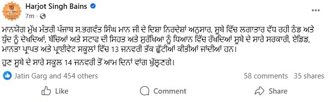 ਹਰਜੋਤ ਬੈਂਸ ਨੇ ਟਵੀਟ ਕਰਦਿਆਂ ਲਿਖਿਆ ਕਿ ਮੁੱਖ ਮੰਤਰੀ ਪੰਜਾਬ ਭਗਵੰਤ ਸਿੰਘ ਮਾਨ ਦੇ ਨਿਰਦੇਸ਼ਾਂ ਅਨੁਸਾਰ ਸੂਬੇ ਵਿੱਚ ਲਗਾਤਾਰ ਵੱਧ ਰਹੀ ਠੰਢ ਅਤੇ ਧੁੰਦ ਨੂੰ ਦੇਖਦਿਆਂ ਬੱਚਿਆਂ ਅਤੇ ਸਟਾਫ ਦੀ ਸਿਹਤ ਅਤੇ ਸੁਰੱਖਿਆ ਨੂੰ ਧਿਆਨ ਵਿੱਚ ਰੱਖਦਿਆਂ ਸੂਬੇ ਦੇ ਸਾਰੇ ਸਰਕਾਰੀ, ਏਡਿਡ, ਮਾਨਤਾ ਪ੍ਰਾਪਤ ਅਤੇ ਪ੍ਰਾਈਵੇਟ ਸਕੂਲਾਂ ਵਿੱਚ 13 ਜਨਵਰੀ ਤੱਕ ਛੁੱਟੀਆਂ ਕੀਤੀਆਂ ਜਾਂਦੀਆਂ ਹਨ। ਹੁਣ ਸੂਬੇ ਦੇ ਸਾਰੇ ਸਕੂਲ 14 ਜਨਵਰੀ ਤੋਂ ਆਮ ਦਿਨਾਂ ਵਾਂਗ ਖੁੱਲ੍ਹਣਗੇ।